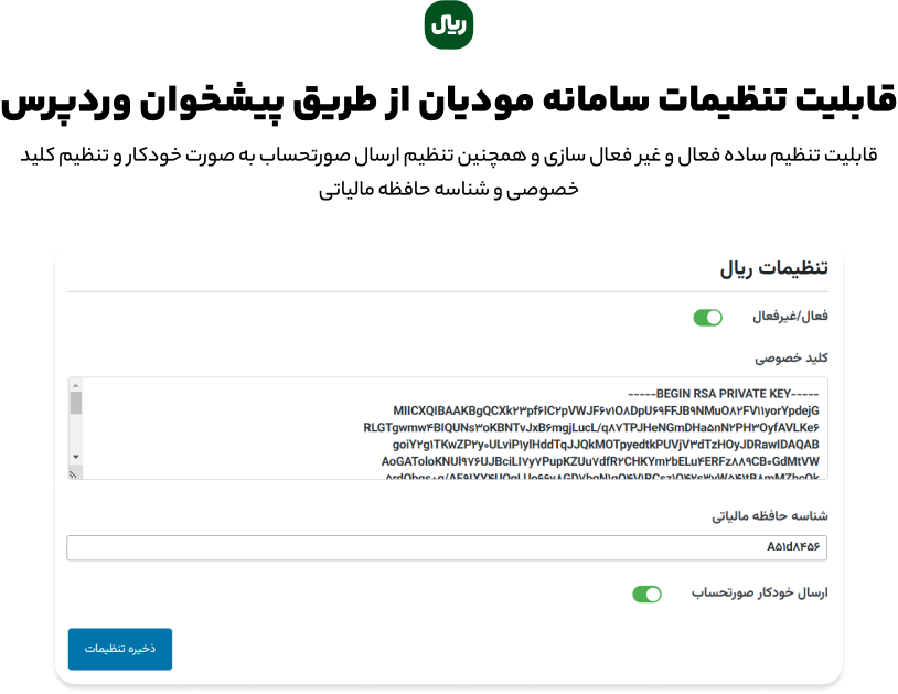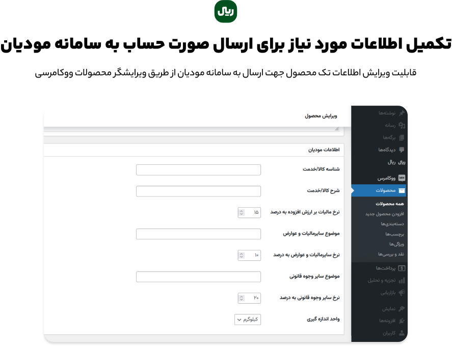 افزونه “ریال” یک ابزار حرفهای و پیشرفته برای مدیریت و ارسال صورتحسابهای مالی به سامانه مودیان است که به صورت کاملاً یکپارچه با وردپرس و ووکامرس عمل میکند. این افزونه با رعایت قوانین و الزامات مالیاتی کشور، امکان ثبت و ارسال اطلاعات مالی را به صورت دقیق و سریع فراهم میکند.